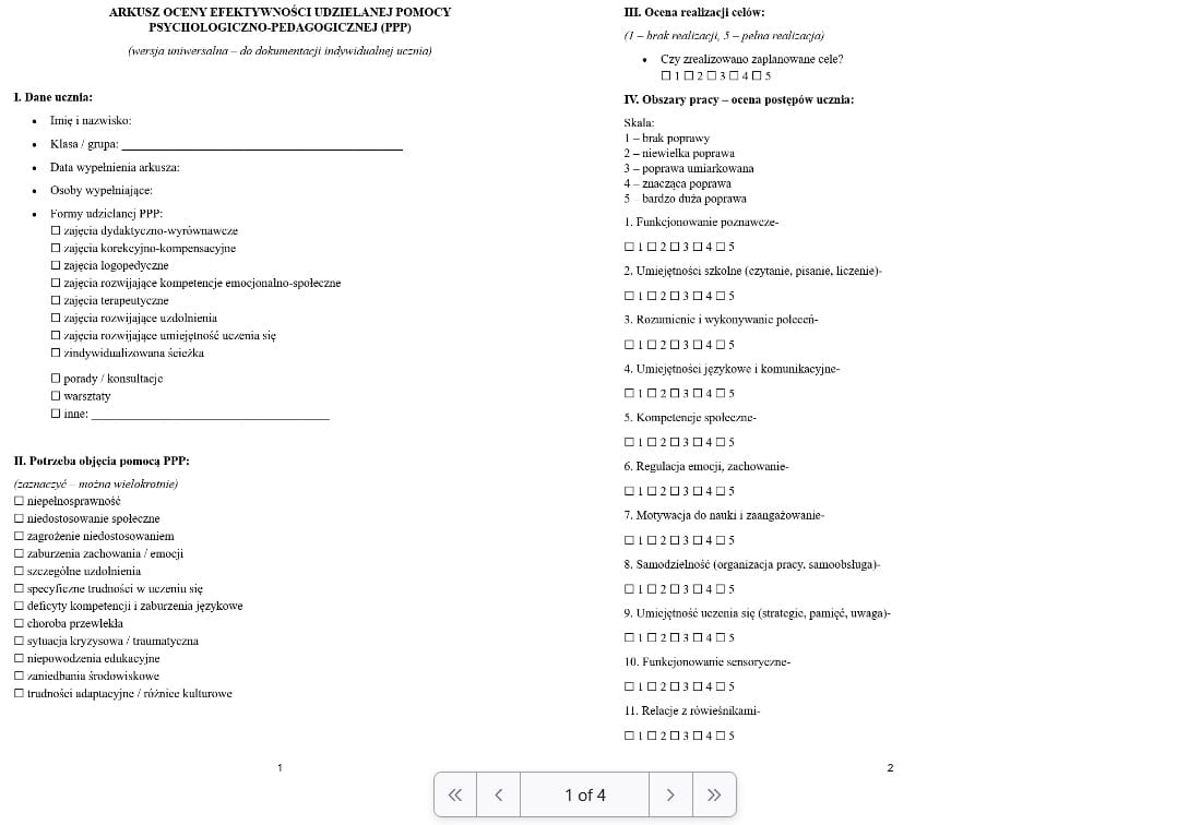 Arkusz zawiera wyłącznie odpowiedzi do zaznaczenia, co znacząco ułatwia i przyspiesza pracę specjalistów i nauczycieli. Obejmuje pełną ocenę wszystkich wskazanych w rozporzędzeniu form PPP w tym: realizacji celów, 15 obszarów funkcjonowania, skuteczności metod, form i środków dydaktycznych, stopnia zaangażowania ucznia oraz potrzeb dalszego wsparcia.