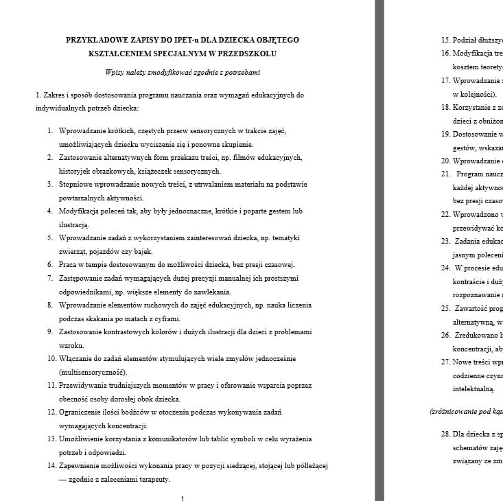 Materiał zawiera ponad 200 gotowych, proponowanych do użycia wpisów do dwóch kluczowych dokumentów w pracy z dzieckiem w wieku przedszkolnym – Indywidualnego Programu Edukacyjno-Terapeutycznego (IPET) oraz Wielospecjalistycznej Oceny Poziomu Funkcjonowania Dziecka (WOPF).