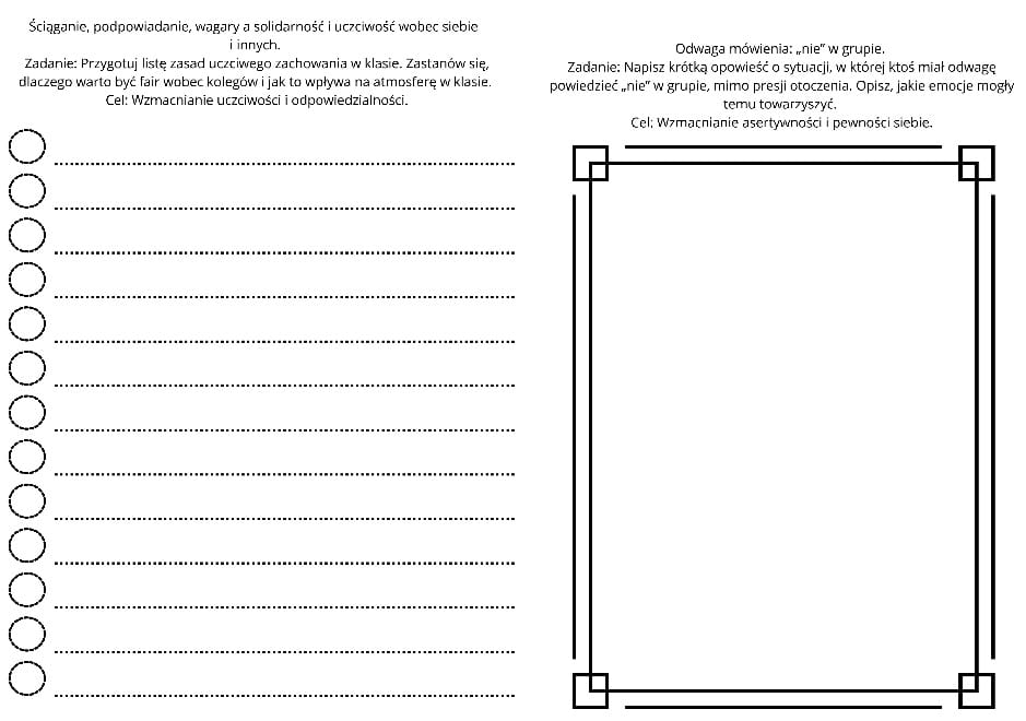 • Ponad 30 zadań na osobnych stronach, obejmujących różnorodne tematy, takie jak współpraca, empatia, tolerancja, rozwiązywanie konfliktów, zdrowie psychiczne i fizyczne, a także rozwijanie poczucia odpowiedzialności i umiejętności komunikacji.