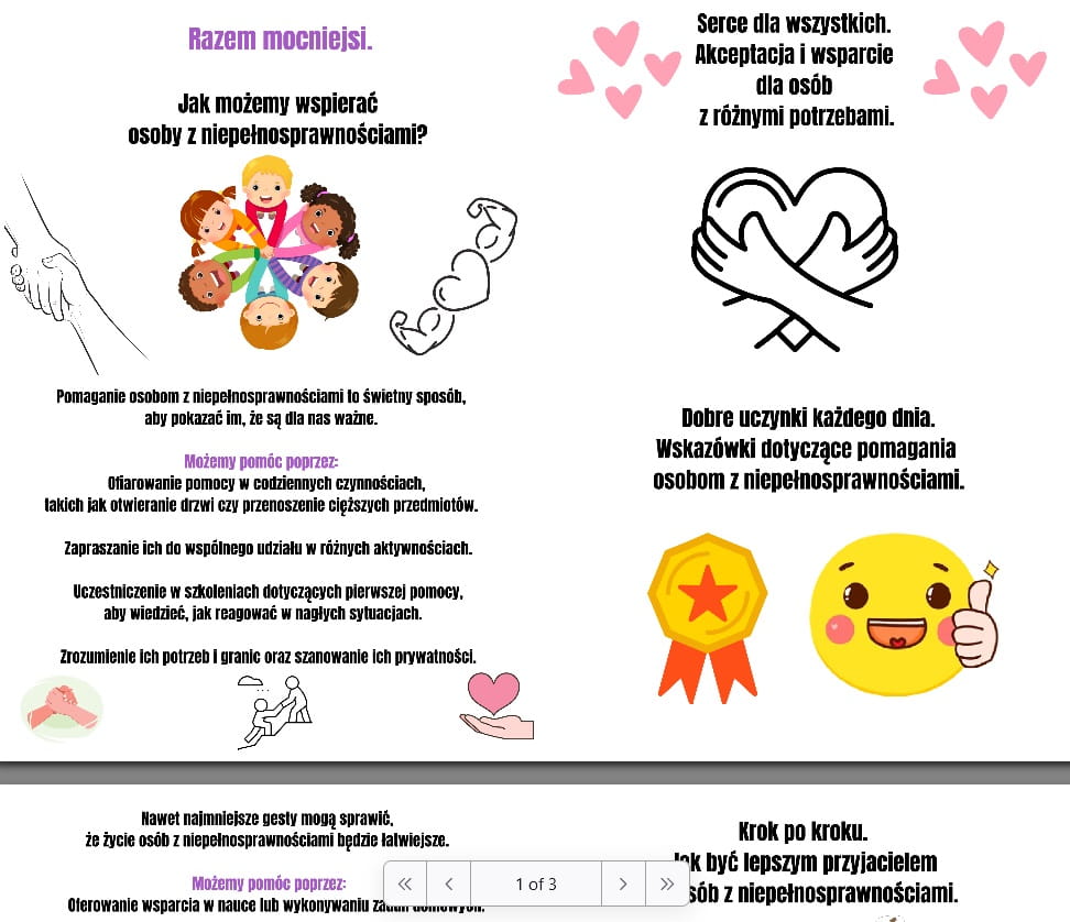 Materiał cyfrowy do samodzielnego wydruku składający się z 10 kart w formacie A4 mający na celu przedstawienie uczniom różnorodności dotyczącej form niepełnosprawności oraz promowania wsparcia.