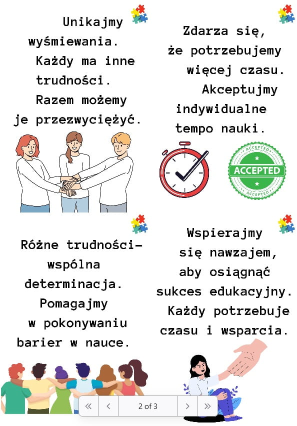 Gazetka w przyjazny sposób porównuje zróżnicowane potrzeby rozwojowe i edukacyjne uczniów do indywidualnej drogi rozwoju oraz propaguje postawę pomocy wobec innych.