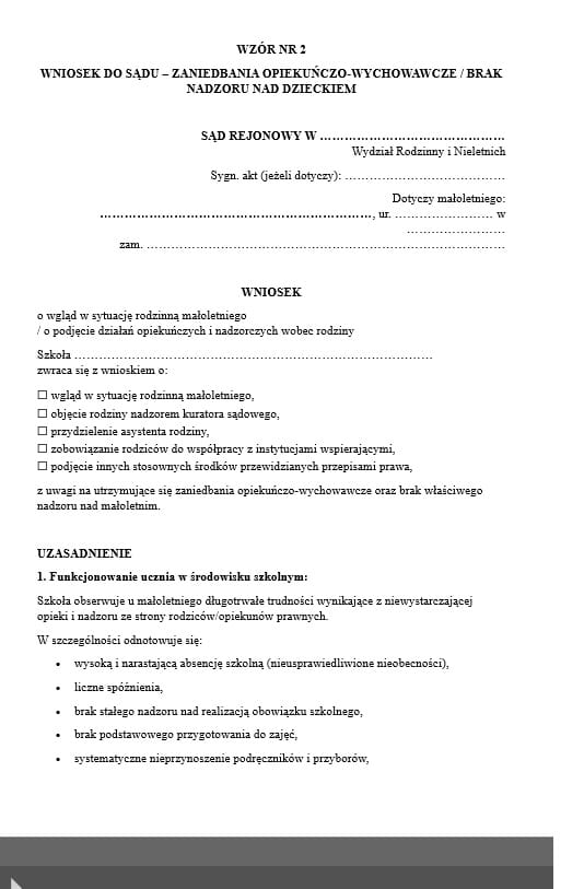 Zbiór uniwersalnych wniosków do Sądu Rejonowego – Wydziału Rodzinnego i Nieletnich, opracowany z myślą o dyrektorach szkół, pedagogach i psychologach szkolnych.